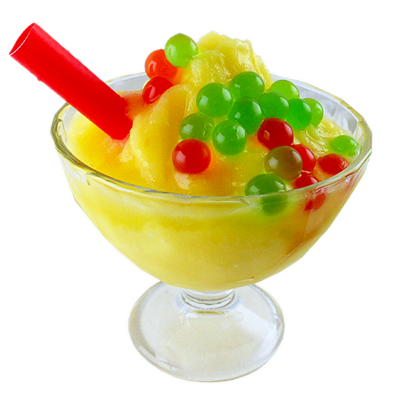 ストロベリーフレーバーポッピングボバは、鮮やかな赤色と甘酸っぱさが特長の球状スイーツです。
